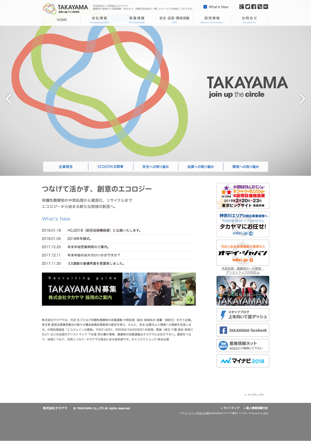 上記2サイトのスピンオフとして誕生したエンターテイメントなプロモーションサイトです。“おもしろおかしく、真面目に。”をスローガンに、各部署の社員参加により、作業現場で使用する各種の器具類を持ち、レンジャー戦隊ならぬ“環境戦隊”と称して、業務への熱いこだわりを、ユーモラスに演出しています。