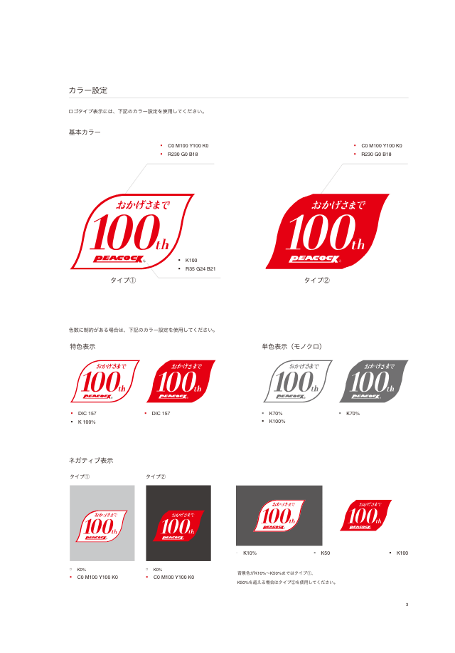 100周年ロゴのコンセプト・取扱い・使用基準等を記載したブランドマニュアル。