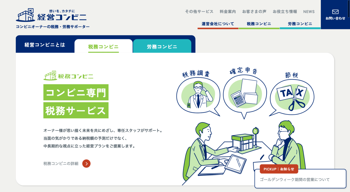 コンビニ向け税務・労務サービスの独自モデルの事業ホームページ制作。統一したイラストや色調でブランド化を推進。